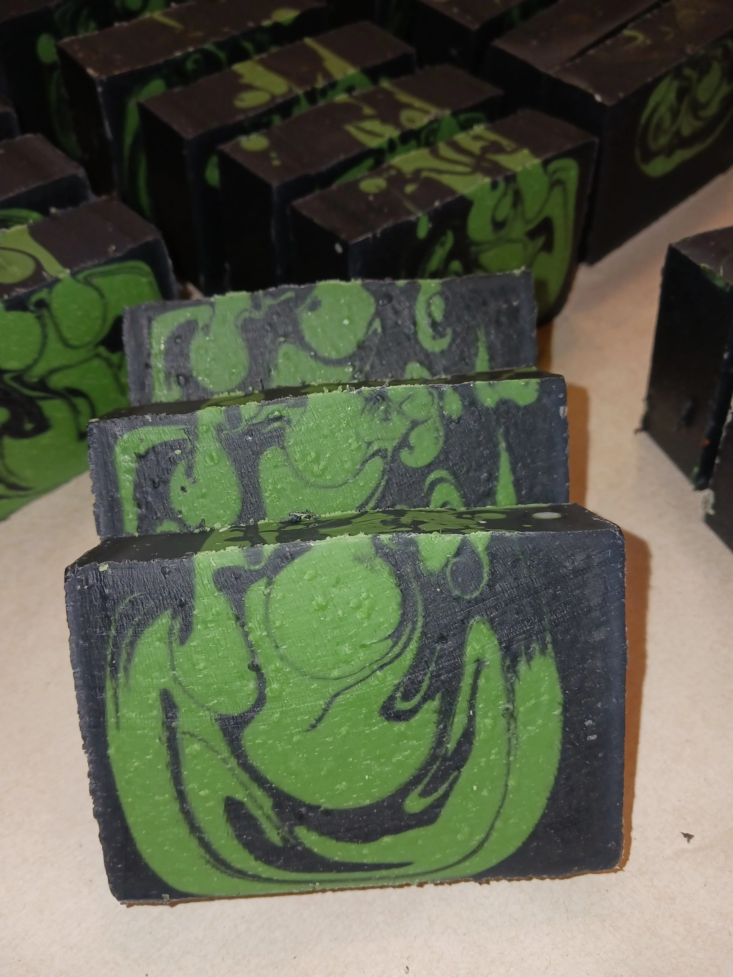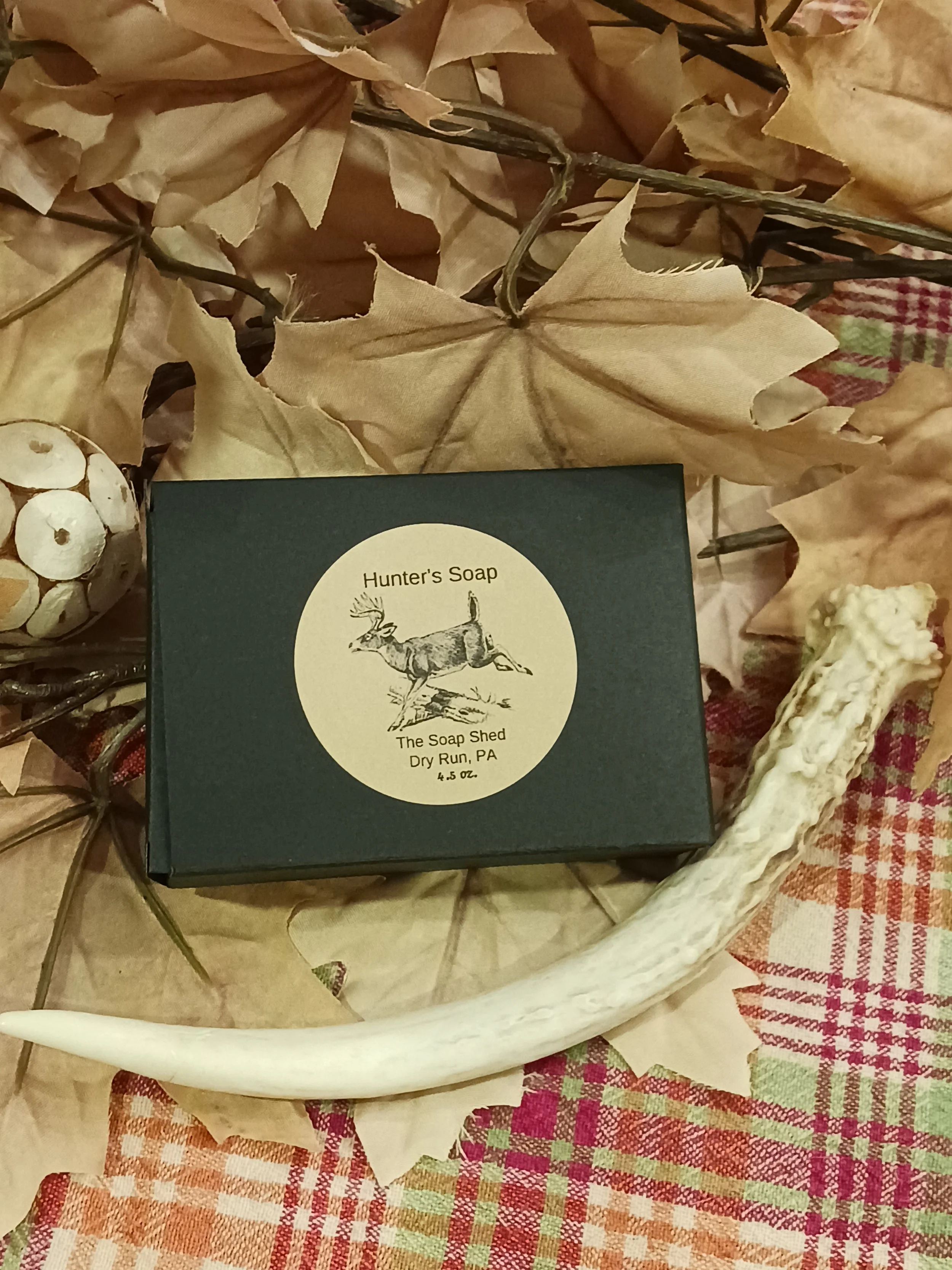 Our Hunters Soap is a scent free bar of Soap. You get the cleaning power without any added smell. Colored green and black. These are wrapped in tissue paper and gift boxed. 4.5 oz